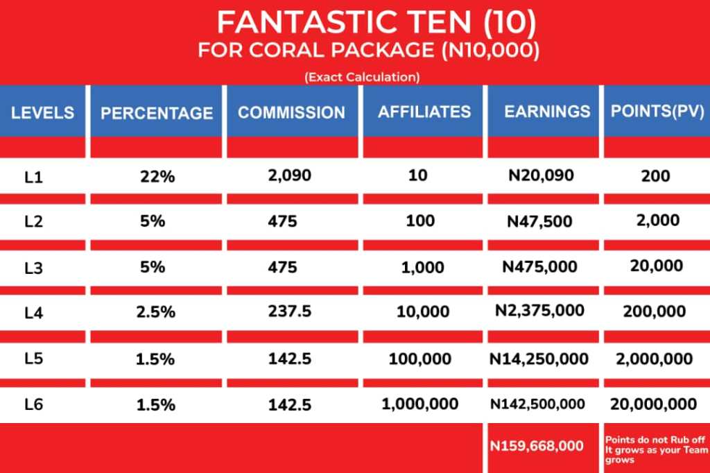 📘Coral, ₦10,000 – You get registration bonus of ₦1,000 and 20PV. ( 6level EARNING and 1 level PV)